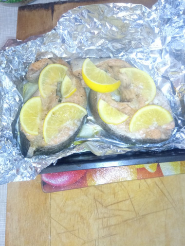Стейки у меня были небольшие,я взяла 4 шт,которые сложила в миску. Добавила соль,перец, лимонный сок,масло растительное, аккуратно перемешала и оставила минут на 5. Затем выложила на фольгу по 2шт. Завернула фольгу и убрала в духовой шкаф запекаться на 25 минут при 180°. Затем открыла фольгу, положила на рыбку дольки лимона и ещё на 10 минут.