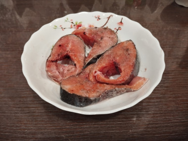 Стейк очистите от чешуи, промойте и промокните от излишков воды бумажным полотенцем.