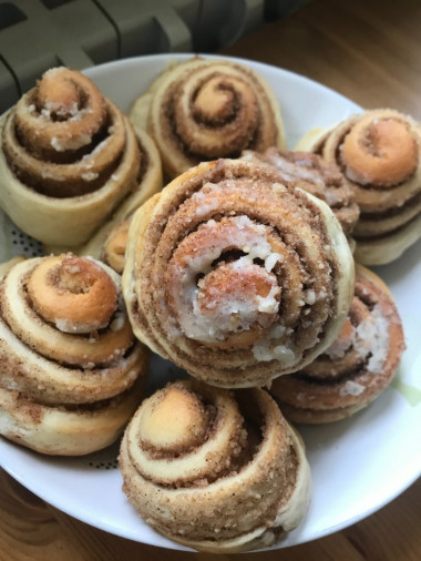 Оставляем булочки для подъема на 20 минут. Перед выпечкой булочки смазываем и запекаем при 180 С в течение 20 минут до готовности.