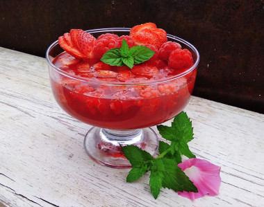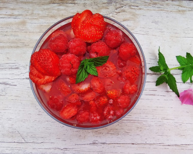 Дети запросили "желейку") Собрала сентябрьскую клубнику с малиной и пошла готовить желе. В качестве жидкой основы взяла клюквенный морс, он немного мутноватый, но некоторая прозрачность присутствует. К тому же уравновешивает сладость ягод. Добавила ложку сахара, а то детям не сладко было) Количество желатина на этот объем жидкости как раз подходит для крепкого желе. Оно не жидкое, но и не похоже не жевательный мармелад. В самый раз, надо будет запомнить соотношение, а лучше сохраню рецепт и буду подсматривать в следующий раз) Кстати желатин у меня тоже самый обычный, крупными гранулами. Еще заметила, когда готовила вторую порцию (первую сразу съели)), залила желатин слегка теплым морсом и желатин не набух как надо, а превратился в одну большую тянучку. Потом он разошелся, конечно, при нагревании. Но лучше все-таки заливать его холодной жидкостью.