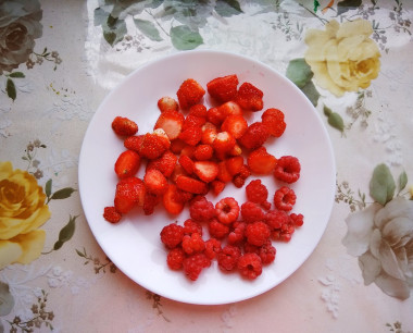 В заранее подготовленные креманки положите ягоды клубники и малины, заполнив емкость чуть больше половины. Крупные ягоды можете порезать.