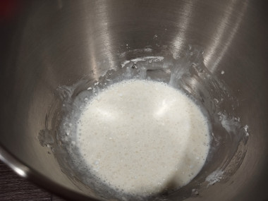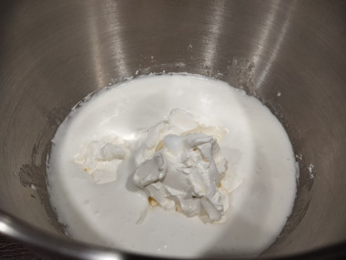 Добавьте к сливкам подготовленную сахарную пудру и включите миксер на малых оборотах, чтобы сахарная пудра успела раствориться в сливках.