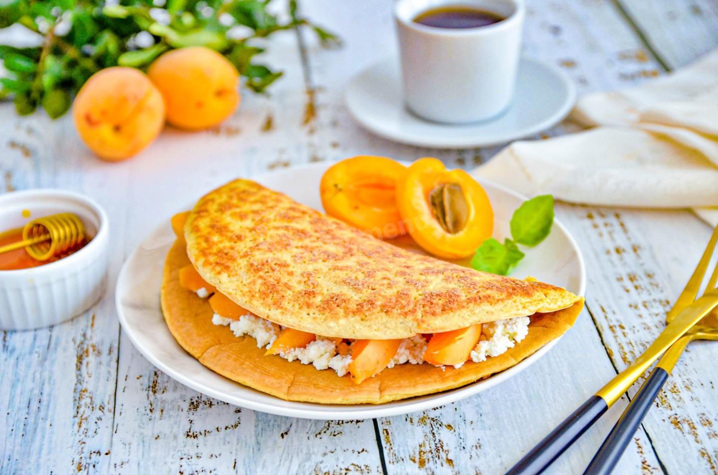 Готовый блин снимите на тарелку. Положите начинку на одну сторону. У меня это творог. Сверху я полила творог медом и выложила на него кусочки абрикосов. Аккуратно сложите блин пополам, накрывая начинку. Сразу подавайте. Блин вкуснее всего в теплом состоянии.
