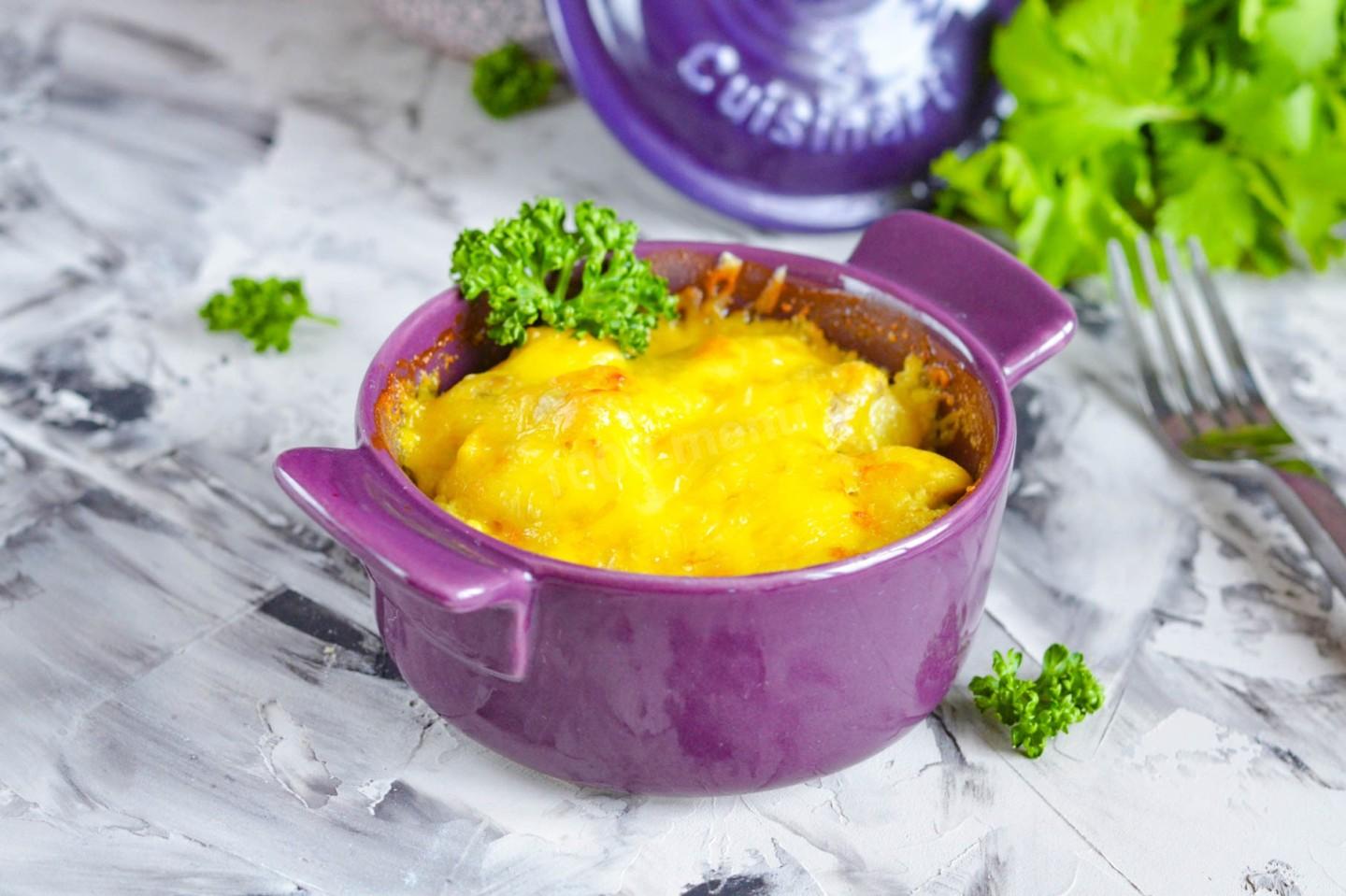 Разложите получившуюся массу по кокотницам или небольшим горшочкам для запекания. Посыпьте жульен тертым сыром.