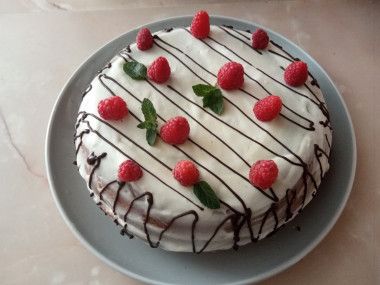 Верхний корж также смажьте кремом и украсьте сеточкой из растопленного шоколада.