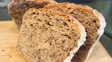 Впервые я пекла хлеб сама и осталась в таком восторге! Оказалось все так просто, не заморочно, не долго и вкусно! Уже раз шесть за три недели успела испечь хлеб по этому рецепту, регулируя добавки по нашему вкусу. Все разы делала на свежих дрожжах (спасибо за указание, сколько их следует добавить, если заменять сухие), а также часть пшеничной муки заменила на цельнозерновую (и вновь спасибо за эту подсказку). Итого с учетом того, что цельнозерновая мука вбирает больше влаги, у меня вышло 100 г ржаной, 100 г цельнозерновой и 150-160 г пшеничной для нужной консистенции теста. В первый раз делала без добавок, только по рецепту. А в последующие в дело пошли семечки подсолнечника и тыквенные, а также стала добавлять немного тмина. И попробовала выпекать не в виде каравая, но еще и в форме для кекса в виде буханки (вариант с буханкой оказался удобнее в нарезании для нас, на фото он с семечками