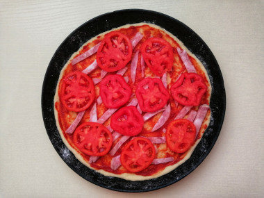 Помидоры помойте, обсушите, нарежьте кольцами и кубиками и так же равномерно выложите по всей пицце.