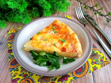 Поверхность будущего пирога решила украсить не только сыром, но и полукружьями помидора. Заодно они придали дополнительной сочности. Выпекался мой пирог 35 минут до образования золотистой, румяной корочки.