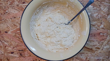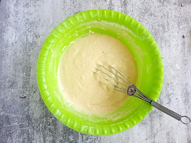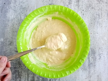 Перемешайте тесто. Если оно у вас получится чересчур жидким, всыпьте еще муки, если слишком крутым — влейте немного кефира. Тесто должно стать по консистенции немного гуще, чем для оладий. У меня ушло меньше муки.