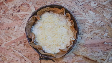 Мне захотелось, чтобы пирог получился широким, поэтому выпекала его в круглой форме диаметром 24 см. На дно постелила пергамент, т. к. сыр обычно прилипает.