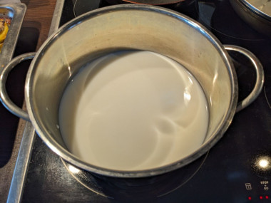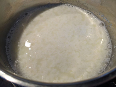 Возьмите кастрюлю подходящего размера и налейте в нее молоко. В тонкостях выбора кастрюли поможет разобраться статья в конце этого рецепта. Поставьте молоко нагреваться на небольшой огонь. Если у вас есть кулинарный термометр, то следите за температурой нагревающегося молока с помощью него. Если нет, то ориентируйтесь на само молоко. Молоко нужно нагреть до температуры 93°С. По всем признакам молоко уже готово закипеть, над ним идет пар.