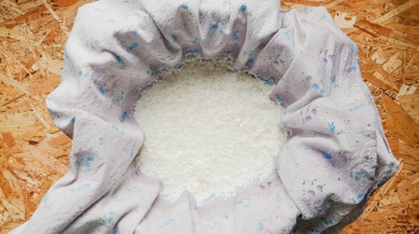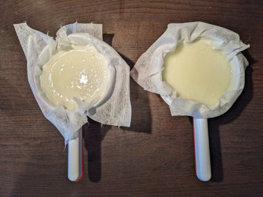 Сыр делала из хорошего, но магазинного, молока и лимонной сока. Взяла пропорции в 2 раза меньше, чем указано в рецепте. И делала без термометра. Молоку закипеть не давала, нагрела в меру, выключила плиту, чуть посолила и потом влила лимонный сок. Постепенно начало створаживаться, я оставила его так до полного остывания. Крупинки получились очень мелкие, даже сквозь ситу утекали. Проложила формы для сыра нетканой салфеткой и вылила всё, что было в кастрюле.