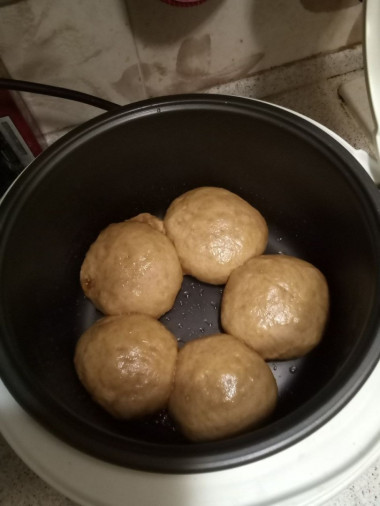 Когда тесто подойдет, делим его на три части, берем одну такую часть, раскатываем в колбаску и разрезаем на кусочки. Каждый кусочек разминаем пальцами в лепешку, кладем на лепешку чайную ложку варенья и защипываем, чтобы получился шарик. Так формируем все булочки. Готовые булочки выкладываем в смазанную растительным маслом чашу мультиварки, закрываем и ставим режим подогрева на 15 минут (чтобы булочки поднгялись), затем устанавливаем режим "выпечка" и выпекаем булочки 60 минут (до румяной корочки). В чашку мультиварки входит примерно 6 - 7 булочек. Оставшееся тесто можно разделить пополам и убрать в морозильник до следующего приготовления булочек :).