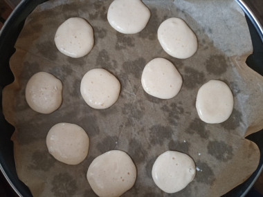 Противень застелите пергаментом для выпечки. Отсадите на него кружочки диаметром 4-5см, оставляя между ними расстояние, так как бисквиты вырастут при выпечке. С выбором пергамента поможет статья по ссылке в конце рецепта.