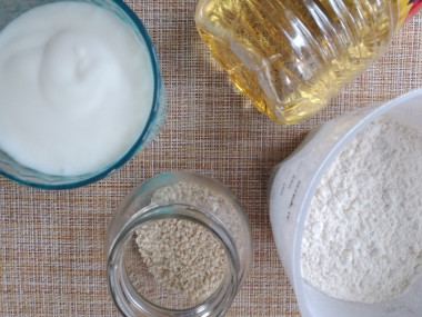 Как испечь лепешки на кефире в духовке без дрожжей? Подготовьте все необходимые ингредиенты. Кефир должен быть комнатной температуры, поэтому его нужно заранее (примерно за 1 час) вылить в стакан и оставить нагреваться в кухне. Муку берите высшего сорта. О замене соды на разрыхлитель читайте в статье по ссылке в конце рецепта.
