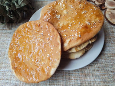 Разделила тесто на шесть частей и на припыленной поверхности стала раскатывать в лепёшки. На одном противне помещалось по две лепёшки. Обмазывала их водой в которой растворила немного соды и присыпала кунжутом. Выпекались они примерно 15 минут.
