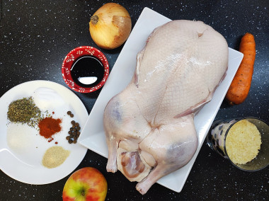 Как запечь утку с рисом в духовке? Подготовьте необходимые ингредиенты. Вместо сахара можно использовать бальзамический соус. Он сделан на основе бальзамического уксуса. У него вязкая консистенция, фруктовый аромат и сладковато-кислый вкус. Рис лучше использовать длиннозерный, чтобы в итоге не получилась каша.