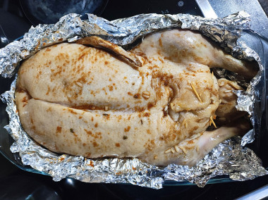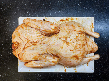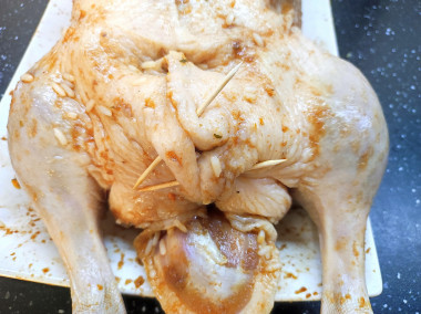 Брюшко зашейте нитками или закройте зубочистками. Крылья и ножки свяжите толстой ниткой, как на фото. Таким образом готовое блюдо будет выглядеть аккуратно и красиво.