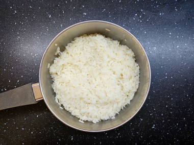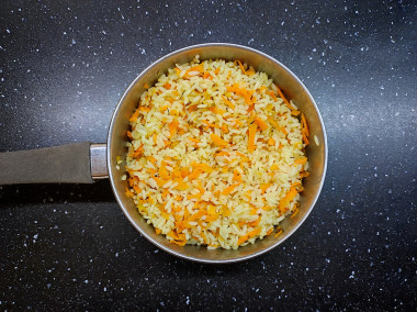 Рис промойте несколько раз в проточной воде. Насыпьте рис в кастрюлю, залейте водой и отправьте на сильный огонь. После закипания огонь убавьте до среднего и варите около 5-7 минут до полуготовности риса. Пока варится рис, сделайте зажарку.