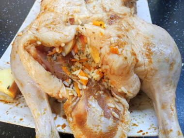 Утку начините рисом с овощами, оставьте немного места для яблок.