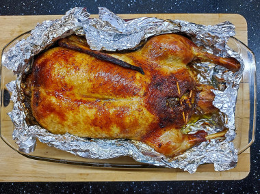 Заверните начинённую утку в фольгу, отправьте в форму для запекания и поставьте в духовку примерно на 1 час при 180-190 градусах, режим "верх-низ". По истечении указанного времени достаньте форму из духовки, фольгу сверху разрежьте и отправьте утку снова запекаться на 1-1,5 часа. точное время зависит от особенностей вашей духовки. За 15-20 минут до готовности измените режим духовки на конвекцию, для образования румяной корочки.