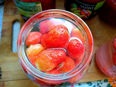 Заполняем банку с клубникой закипевшим в кастрюле сиропом до самого верха.