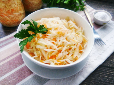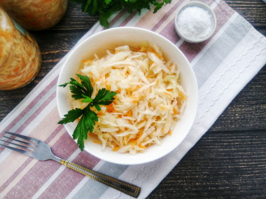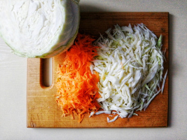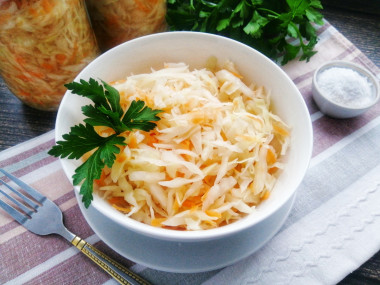 Как сделать сочную и хрустящую квашенную капусту в банке на зиму без рассола? Подготовьте все необходимые ингредиенты. Для квашения выбирайте поздние сорта капусты приплюснутой формы, у них более плотная структура и, если все правильно сделать, из них получается сочная и хрустящая квашенная капуста. Капусту нашинкуйте некрупной соломкой любым удобным для Вас способом - острым ножом или специальной теркой.