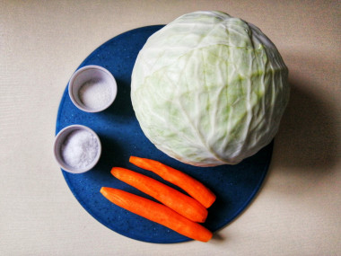 На полкачана капусты взяла три небольших морковки, столовую ложку соли и половину чайной ложки сахара.