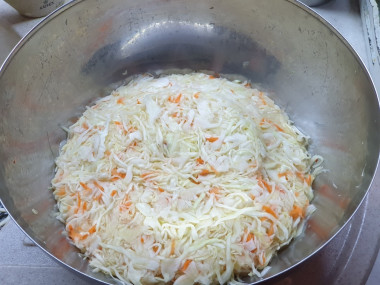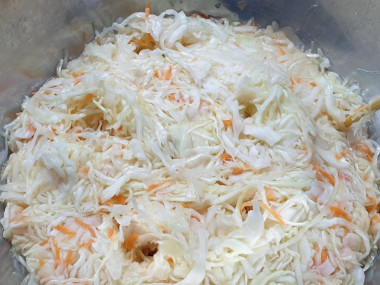 Капусту мелко нарезала, морковь натерла на крупной тёрке. Посыпала овощи солью и сахаром, хорошенько помяла, чтобы выделился сок. Но на мою беду, как я не старалась, сока вышло очень мало. Поэтому, переложив капусту в кастрюлю, в которой ей предстояло кваситься, и плотно утрамбовав её, добавила к ней кипяченую остывшую воду.