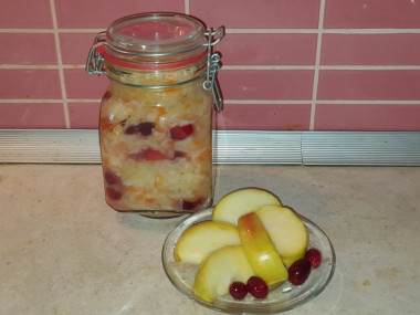 Такую капусту готовлю часто. В холодное время это настоящий кладезь витаминов и микроэлементов. Рецепт мне нравится своей простотой и бюджетным набором продуктов. Могу предложить небольшую коррекцию дозировок необходимых специй. На мой вкус рекомендую на 1 кг капусты 20 грамм соли и 5 грамм сахара. Проверено временем и так получается оптимальное содержание соли, ну это на мой вкус. Клюква это блюдо украшает, делает еще более витаминизированным И предлагаю маленькое дополнение к рецепту, во время квашения положить к капустной массе нарезанные дольками яблоки. Обожаю их привкус и аромат в капусте. А еще люблю пить сок из этой капусты, в меру соленый, квашенный, ядреный и очень вкусный.