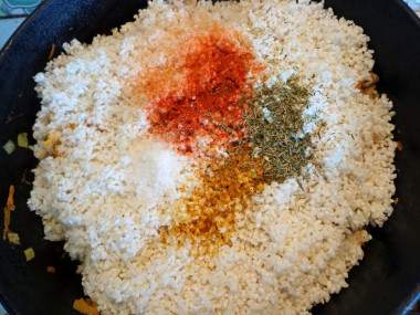 А теперь обжариваем содержимое сковороды на среднем огне в течение 5 минут, перемешивая. Не пропускайте этот пункт, так как при обжарке рис приобретает более насыщенные цвет и аромат. А так же позволит остаться ему рассыпчатым и не склеиться.