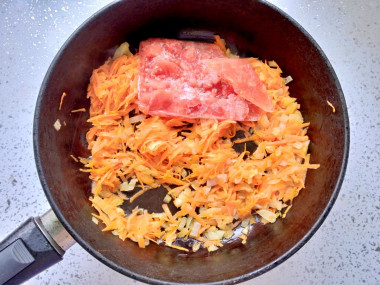 Добавляем кусочки тушенки в сковороду с обжаренными овощами.