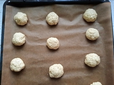 Противень или форму для запекания застелите пергаментом. Выбрать пергаментную бумагу поможет статья по ссылке в конце рецепта. Чайной ложкой (или ложкой для мороженого) берите немного теста и мокрыми руками снимайте его на противень. Укладывайте печенье на расстоянии друг от друга - при выпекании оно немного растечётся. Выпекайте печенье около 20 минут в предварительно разогретой духовке до золотистого цвета. Точное время зависит от вашей духовки.