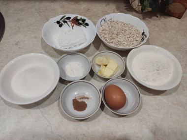 Я сначала смешала сухие ингридиенты, а затем добавила тертое масло, яйцо и творог. Овсянка у меня тоже мелкая, которая варится 3 минуты. Мука первого сорта. Корицу заменила на ванилин. Творог был влажный, поэтому добавила ложку муки.