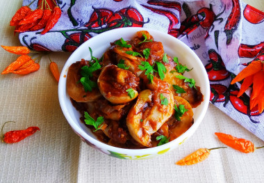 Синенькие отправьте в сковородку с соусом, перемешайте и доведите до кипения на сильном огне. Добавьте соль по вкусу. Прокипятите 2-3 минуты. Попробуйте снова на вкус и добавьте при необходимости недостающий компонент (соль, сахар или уксус).