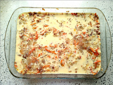 Залейте вермишель с фаршем яично-молочной смесью. Поставьте запеканку в заранее разогретую до 180°С духовку на 20-25 минут. Время приготовления будет зависеть от высоты запеканки и от особенностей работы духовки.