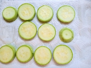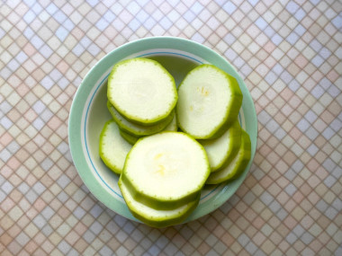 Молодые кабачки я нарезала на шайбочки шириной 1 см. или чуть толще. Мне нравится, когда кабачок хрустит.