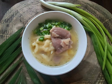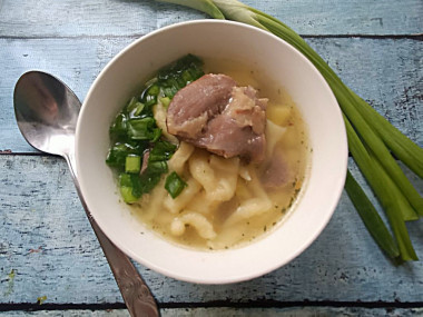 Суп из гуся с лапшой очень вкусное и сытное блюдо. Хочу заметить, чем моложе птица, тем мясо будет нежнее и мягче. У меня был домашний гусь . Для начала поставила варить бульон. Положила в кастрюлю крыло и ножку гуся, морковь и лук в шелухе. В процессе варки обязательно нужно снимать пенку. Когда бульон был готов я его процедила через сито и вылила обратно в кастрюлю. Варёные морковь и лук убрала, мне они не понадобились. Мясо нарезала на кусочки средней величины. В процеженный бульон положила нарезанный картофель. И занялась замесом теста для лапши. Делать его очень быстро и легко . А лапша получается очень вкусной. Смешала в миске яйцо, соль и стакан муки. Я бы рекомендовала муку просеять , чтобы не попался мусор. Замесила тесто, завернула в пищевую плëнку ( можно положить в пакет) и оставила его отдыхать на 10 минут. По истечении времени раскатала тесто в тонкий пласт и роликом для нарезки пиццы нарезала на тонкие полосочки, а потом эти полосочки разрезала на несколько частей. Длина лапши у меня получилась примерно 2 сантиметра. Лапшу разложила на разделочной доске, чтобы она немного заветрилась. К этому времени картофель сварился и я к нему добавила лапшу, нарезанное мясо и соль. Когда суп сварился, разлила его по тарелочкам, добавила мелко нарезанный зелёный лучок . Суп из гуся с лапшой получился ароматным, благодаря моркови и луку. Бульон наваристый и прозрачный. Всем советую этот рецепт . Он придётся по вкусу не только взрослым, но и деткам. И не поленитесь, сделайте лапшу сами, тогда вы ощутите проностью вкус супа. Приятного аппетита.