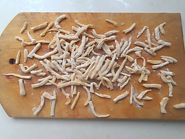 Разделите лапшу руками и оставьте на столе подсушиться.
