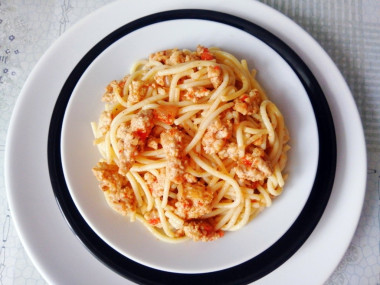 Приготовила блюдо быстро. Фарш сделала из постной свинины. Выкладывала на сковородку поочередно - сначала нарезанные лук и чеснок, потом мясо и, наконец, помидоры (помидорки взяла замороженные). Посолила, добавила в фарш готовую приправу для мяса.