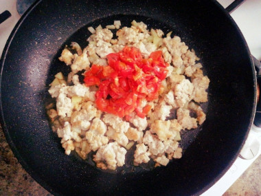 Помидоры вымойте и нарежьте средним кубиком. Можно предварительно снять с них кожицу. Подробнее об этом читайте в конце рецепта. Отправьте в сковороду, посолите и поперчите по вкусу, перемешайте. На этом этапе можно добавить любые другие ваши любимые специи и травы, подходящие для мяса.