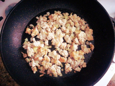 Затем переложите в сковороду фарш и, помешивая, обжарьте его в течение ещё 5 минут.