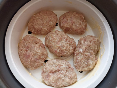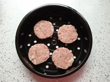 Подготовьте мультиварку к работе. Для этого в специальный отсек налейте воду до верхнего уровня. Далее в мультиварку установите чашу для варки на пару с дырочками). Теперь разделите фарш на равные части (на количество котлет). От желаемого размера котлет зависит количество частей. Но, советую котлеты делать среднего или маленького размера. Из каждой части фарша формируйте круглую или продолговатую котлетку. Выкладывайте котлеты в чашу для варки на пару.