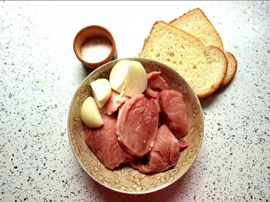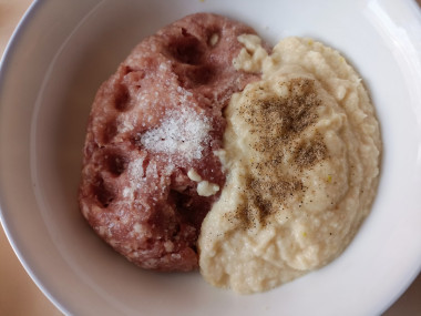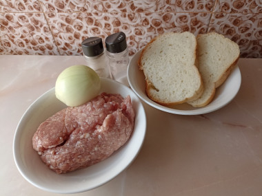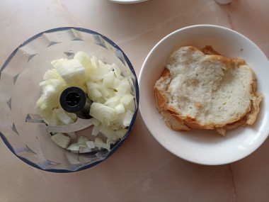Мясо у меня было не жирное из бедренной части. Перекрутила его на мясорубке вместе с луком. Хлеб замочила не в воде, а в сливках. Так получается нежнее на мой вкус. Из специй в фарш добавила немного свежемолотого перца.