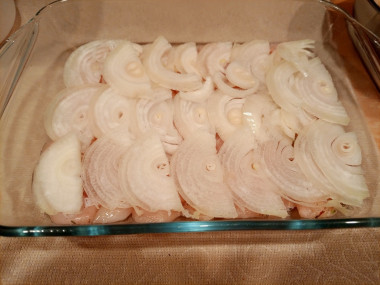 Курицу слегка посолите и немного приправьте специями. Лук очистите от кожуры, промойте и нарежьте тонкими кольцами. Так он быстро приготовится и не будет выпадать при разрезании гратена на порционные куски. Выложите равномерно поверх курицы. Слегка придавите.