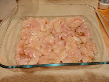 На указанное количество продуктов берите жаропрочную форму примерно 25х35 см с высокими бортами. Если используете силиконовую форму, то смазывать ее не нужно. А вот металлическую, керамическую или стеклянную лучше слегка смазать растительным маслом, чтобы блюдо не пригорело. Филе промойте, просушите бумажными полотенцами, чтобы не выделялась лишняя жидкость. Нарежьте его поперек волокон на тонкие ломтики. Слегка отбейте и плотно выложите на дно формы.
