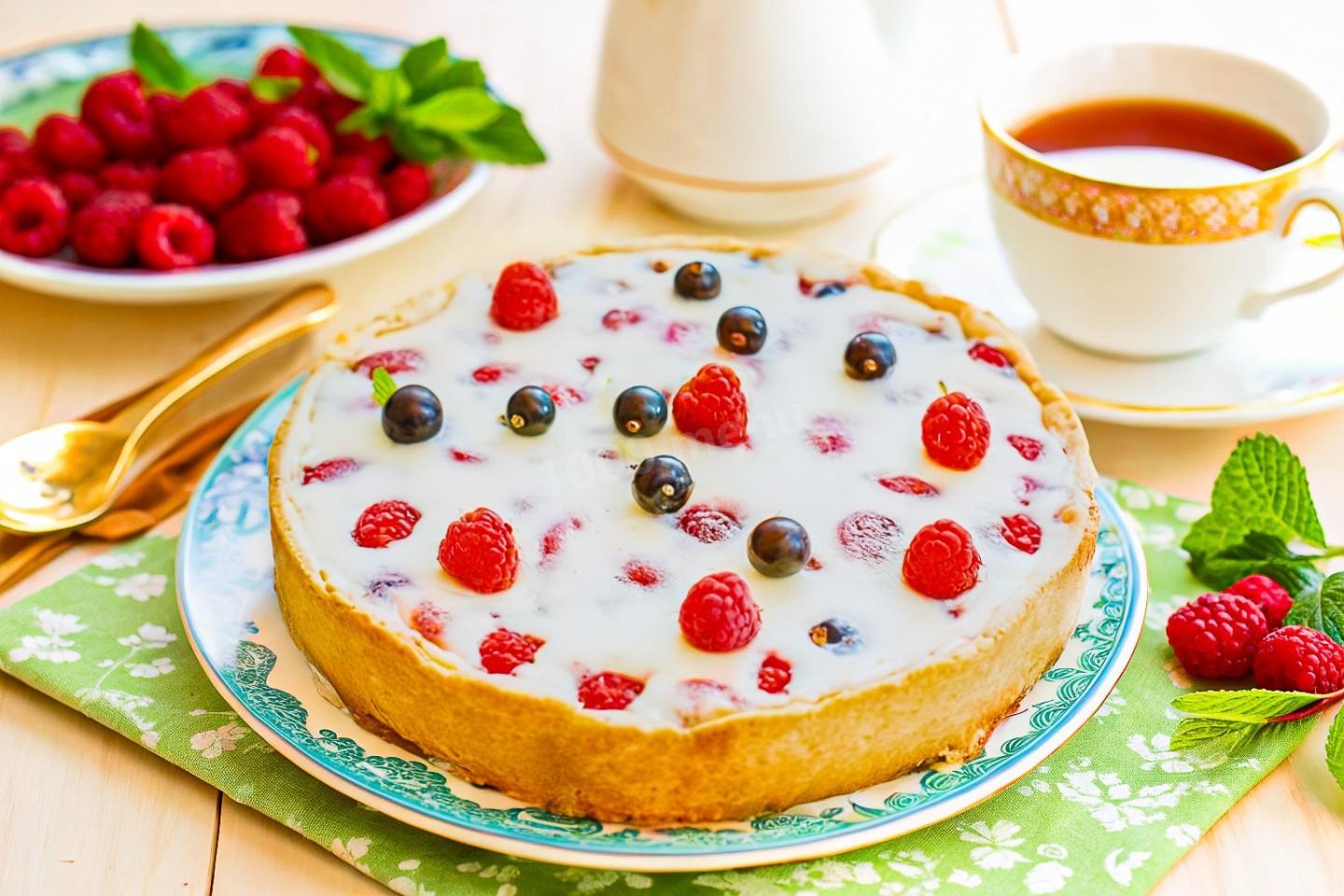 Пироги со сметанной заливкой — это классика европейской и американской кухни. Наш вариант напоминает знаменитый американский «чизкейк» в его деревенском, более простом исполнении, а также французские открытые пироги — тарты. Добавление творога в заливку — типично славянский прием, который делает текстуру более плотной и сытной. Черная смородина и малина — классическое и беспроигрышное сочетание в нашей полосе: кислинка одной идеально оттеняет сладость другой.