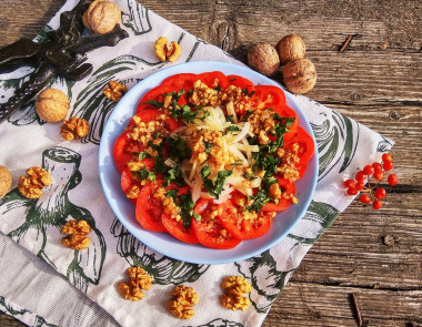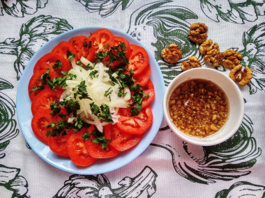 Салатов из свежих помидоров существует множество, но такой мне еще не попадался. Помидоры у меня были заложены на хранение с начала октября еще зелеными, теперь они покраснели и пришел черед их использовать в пищу. Каждый день делаю салаты, хочется уже чего-то нового) Помидоры и лук разложила на тарелке как в рецепте. Далее приступила к заправке, а вот тут ждал сюрприз. Это не просто смешать жидкие ингредиенты как обычно. В заправку добавляются грецкие орехи и чеснок. Орехи я раздавила плоской стороной ножа, а затем порубила, чеснок пропустила через пресс. На вкус впечатляюще! Выложила заправку на кружочки помидоров и лук, потом полила остатками соуса. Настаивался салат до ужина пару часов в холодильнике. Вкус салата очень необычный, пряный, кисло-соленый, слегка острый. Так как помидоры у меня дозревали, то вкуса у них особо нет. Заправка в салате облагородила их. Все вместе очень вкусно, потрясающий букет ароматов! Мужу особенно понравилось) Рекомендую приготовить этот салат, чтобы ощутить всю палитру вкусов.