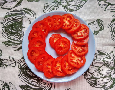 Возьмите широкую, плоскую тарелку для подачи салата. На нее по кругу выложите внахлест кружки помидоров.
