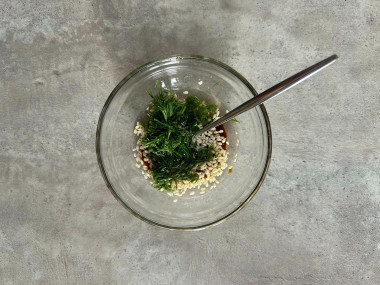 Немного измельчите грецкие орехи (я прокатываю по орехам скалкой и они прекрасно измельчаются), но можно это сделать и ножом. Добавьте орехи в заправку. При желании можно слегка прогреть орехи на горячей сковороде, это придаст им более яркий аромат.